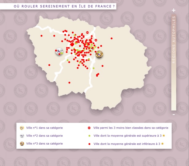 « Raconte-moi ta ville » a également mis en place une catégorie régionale, mais seulement pour l’Ile-de-France. 40 millions d’automobilistes place donc en tête Villiers-sur-Marne (3.56/5), Elancourt (3.52/5) et Ozoir-la-Ferrière (3.48/5), autant d’agglomérations qui n’auraient pas pu être primées si la catégorie n’existait pas.